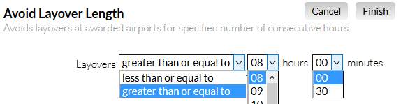 This option allows you to avoid layovers of length less than or greater than a specified time period, by hours and minutes.