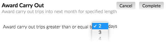 This option allows you to award trips that carry into the next bid month by selecting a minimum trip length. This option will only award trips that begin on the last day of the month and carry out at least the specified number of days.